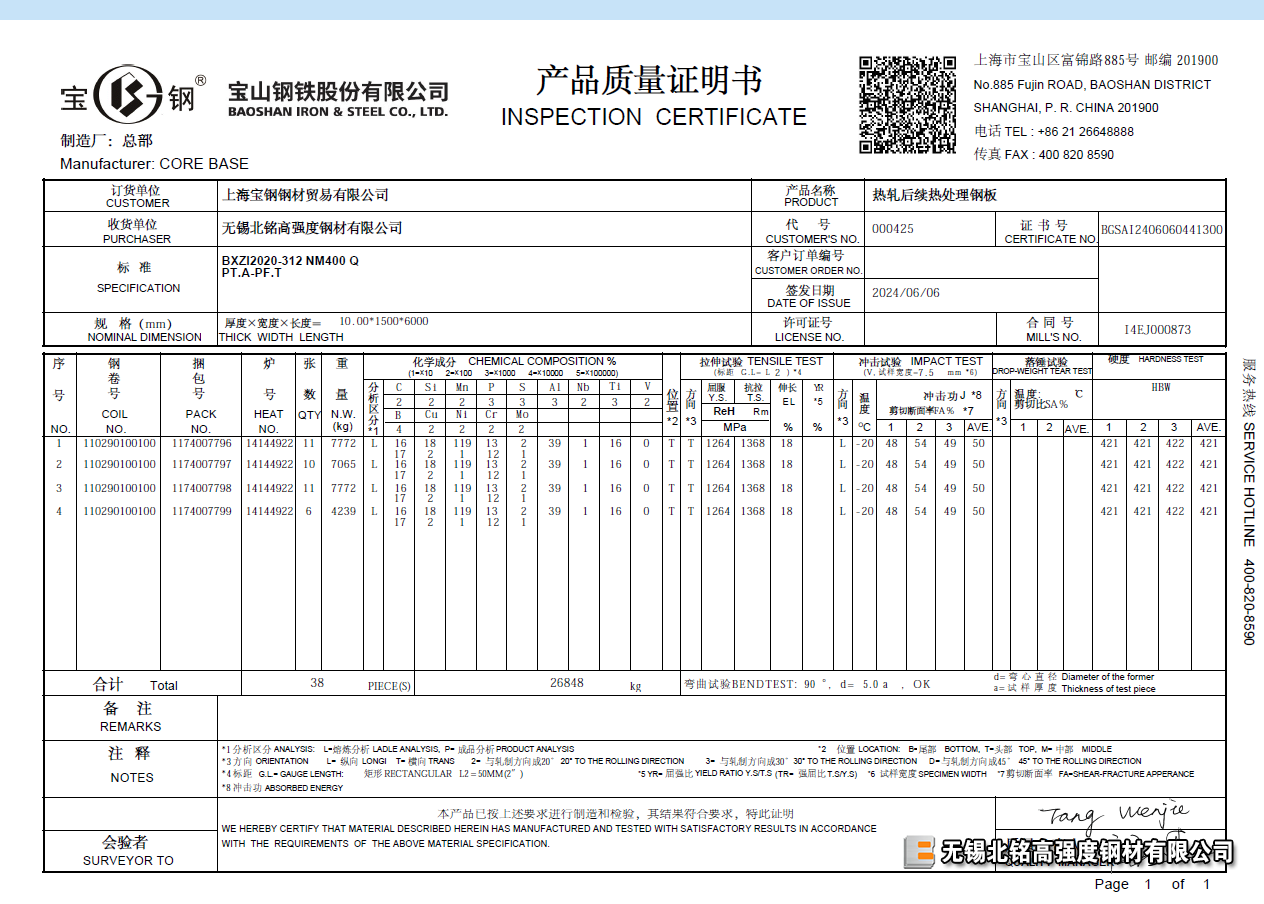 寶鋼耐磨板不光有不錯的耐磨性能,在保證力學(xué)性能的同時,也可保證冷彎折彎性能。 這在國內(nèi)耐磨板中非常少見。歡迎各位新老客戶前來咨詢!如有特殊規(guī)格尺寸可單獨定扎期貨。